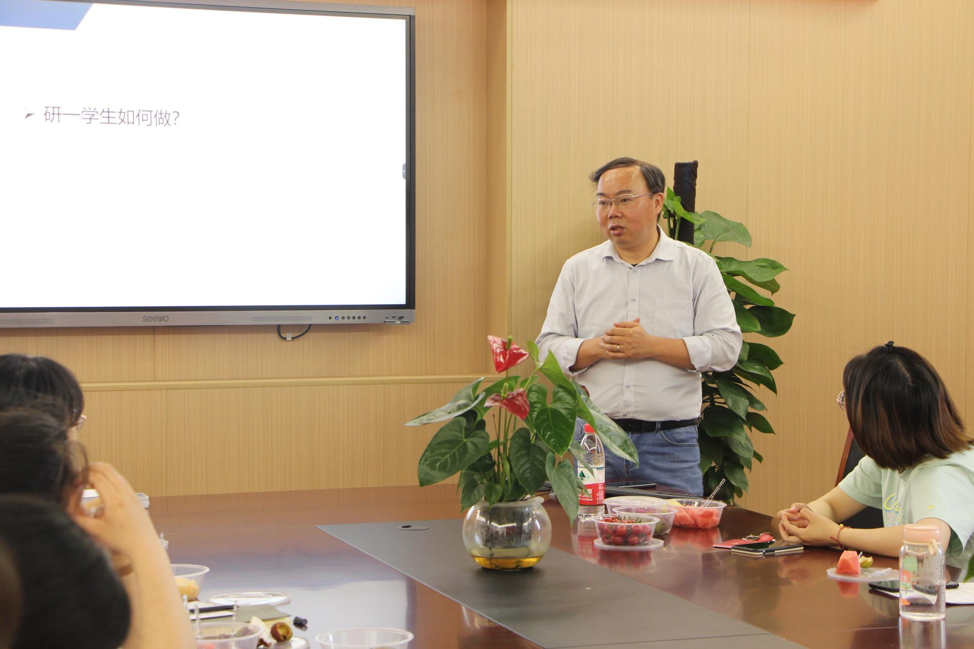 首先,胡老师从学习、生活、工作等方面表达了对同学们的殷切关怀。他回顾了自己读研读博的经历,劝诫同学们要不断审视自己,尽早思考自己的职业目标和人生规划。当感到迷茫之时,不如继续钻研沉淀,付出努力和汗水,才能将无数的偶然转化为成功的必然。他认为,研究生在完成学业的同时,也要积极加强构建自己的人际关系网,为未来适应社会工作奠定基础。最后,胡老师分享了论文的研读方法和技巧,并对学生研读论文时所遇到的一系列问题给予指导性建议。
