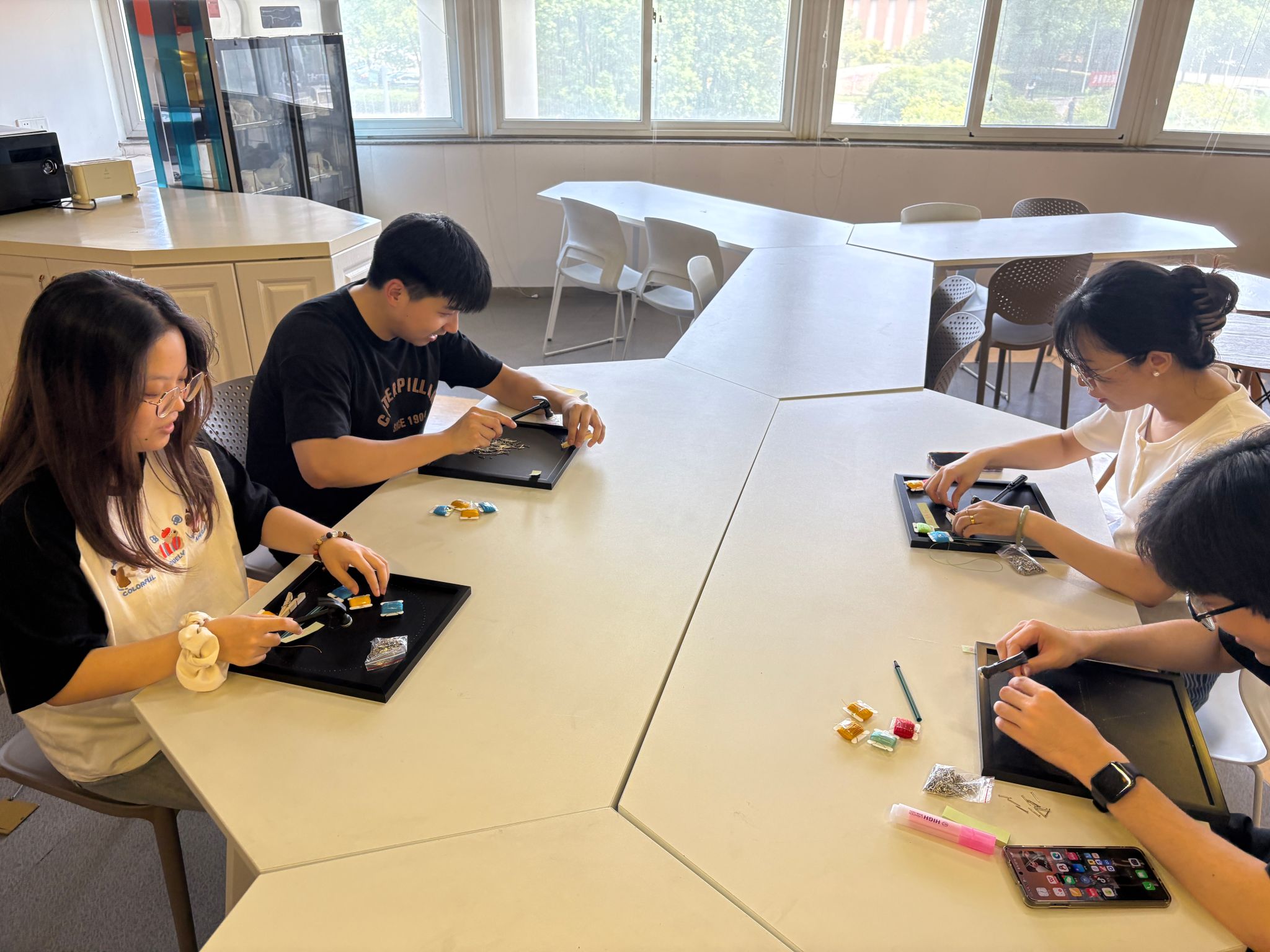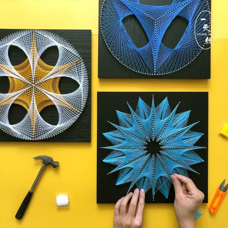 绕线画融合了数学的几何美感与艺术的创意表达,通过钉子定位与毛线缠绕,便能勾勒出一幅幅兼具设计感与层次感的作品。活动现场,老师们暂时放下教学科研的忙碌,兴致勃勃地投入到手作创作中。大家或认真研究图纸,或相互交流缠绕技巧,时而专注思考构图,时而动手调整毛线走向,教工之家里充满了欢声笑语。一根根彩色毛线在指尖穿梭,一颗颗钉子在木板上勾勒轮廓,原本朴素的材料在老师们的巧手下逐渐变成了一幅幅生动有趣的绕线画作品,既有简约的几何图案,也有充满意境的艺术造型。