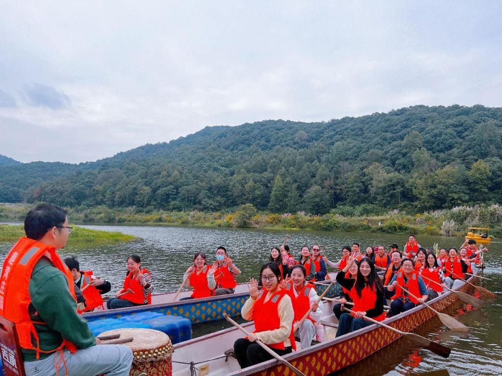 趣湾庄园以其优美的自然风光和丰富的娱乐项目而闻名,是大家放松身心、享受大自然的理想去处。活动当天,蓝天白云,绿树成荫,清澈的湖水在阳光的照射下闪闪发光,一切都显得那么宁静而美好。大家在教官安排下分为了两支队伍进行了一系列的团队拓展活动。龙舟比赛中,在队长的鼓点、副队的尾舵和队员的齐心合力默契配合下,1队获得了胜利;在飞盘游戏中,2队通过精湛技艺赢得了比赛;在速度与激情的越野车项目中,起起伏伏的淌水赛道给大家带来了欢乐和刺激。此外,大家还围坐在一起,畅谈心得。在轻松愉快的气氛中,大家的交流更加深入,友谊也得到了进一步的升华。