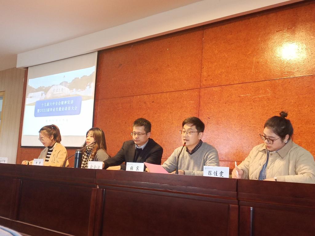 为学习贯彻落实十九届六中全会精神,解决大学生急难愁盼问题,进一步做好2022届毕业生就业工作,帮助毕业生同学熟悉就业政策、了解就业形势、把握就业机会,12月30日学院于9号楼317报告厅召开十九届六中全会精神宣讲暨2022届毕业生就业动员大会。学工办、教务办、研究生办、各毕业班班主任及全体2022届毕业生参加大会。学院党委书记俞金波出席大会并做专题辅导报告。会议由学工办主任张宾主持。
