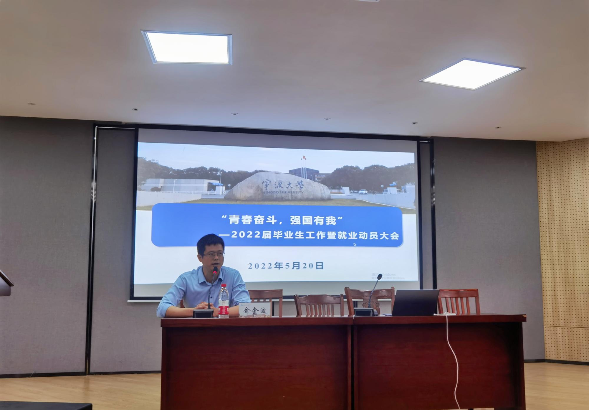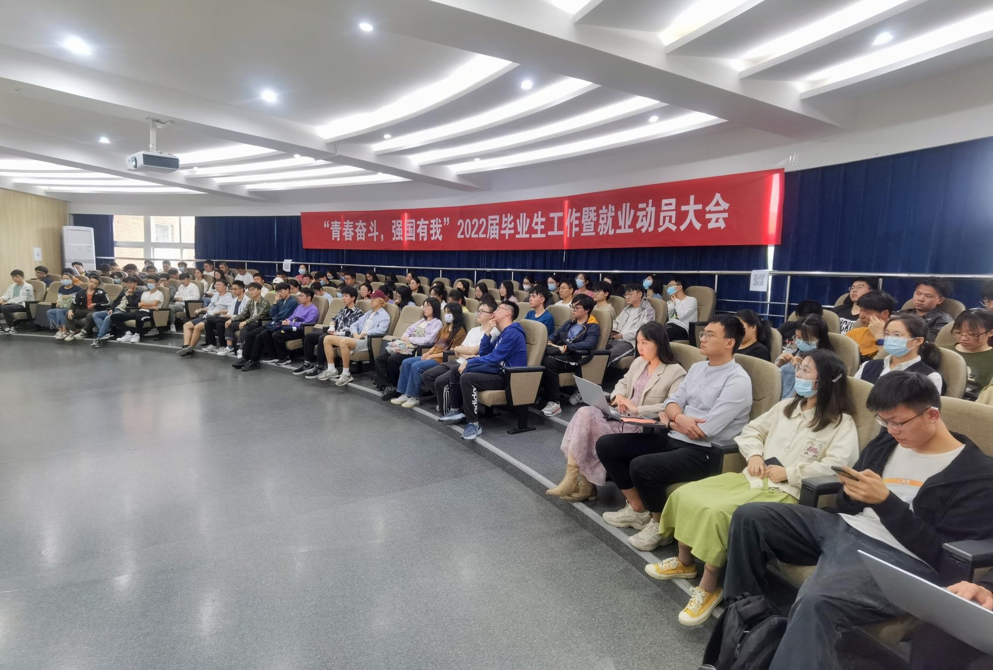 为全面推进落实我院毕业生工作,为毕业生提供全面的就业服务,5月20日下午,我院在113报告厅开展“青春奋斗、强国有我”—2022届毕业生工作暨就业动员大会,学院党委书记俞金波、党委副书记姜萍、学工办主任张宾、团委书记陈佳雯、特邀杰出校友企业家厉刚出席本次会议,全体2022届毕业生共同参会。