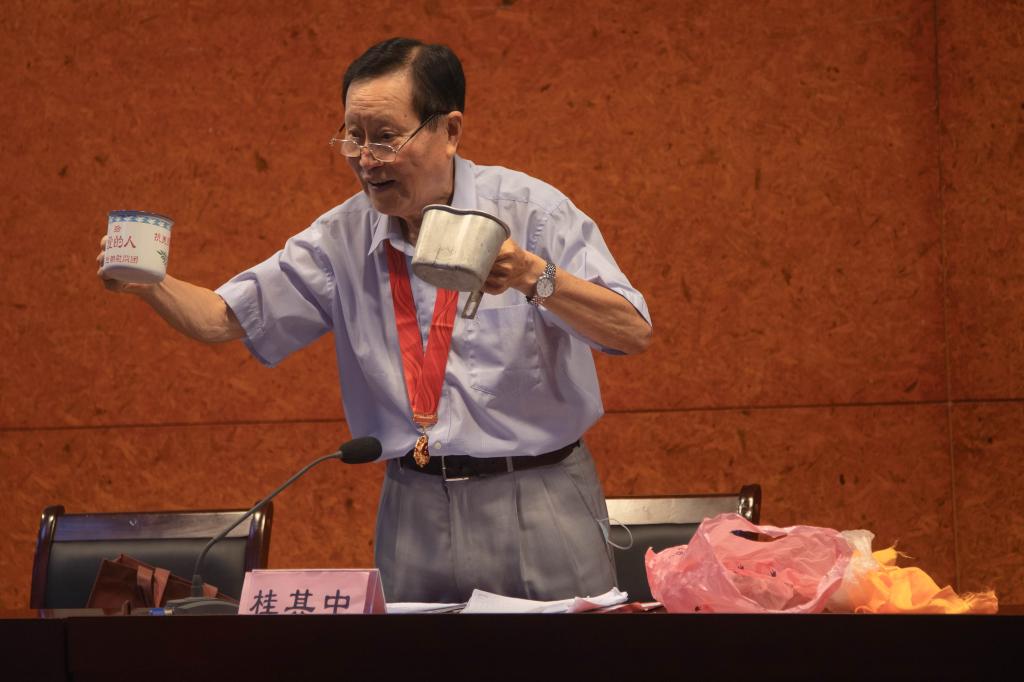 讲到动情处,桂老先生拿出了陪伴他度过那段艰难岁月的杯子,还有一张张仿佛闪耀着红色光辉的合照,虽然时间已相隔甚远,但他仍能唱出那首曾经陪伴着他们挨过最难日子的老歌。他将家国情怀和励志教育结合润物无声地感染着新生们,在开学之初就带给新生一份感动,一份力量。