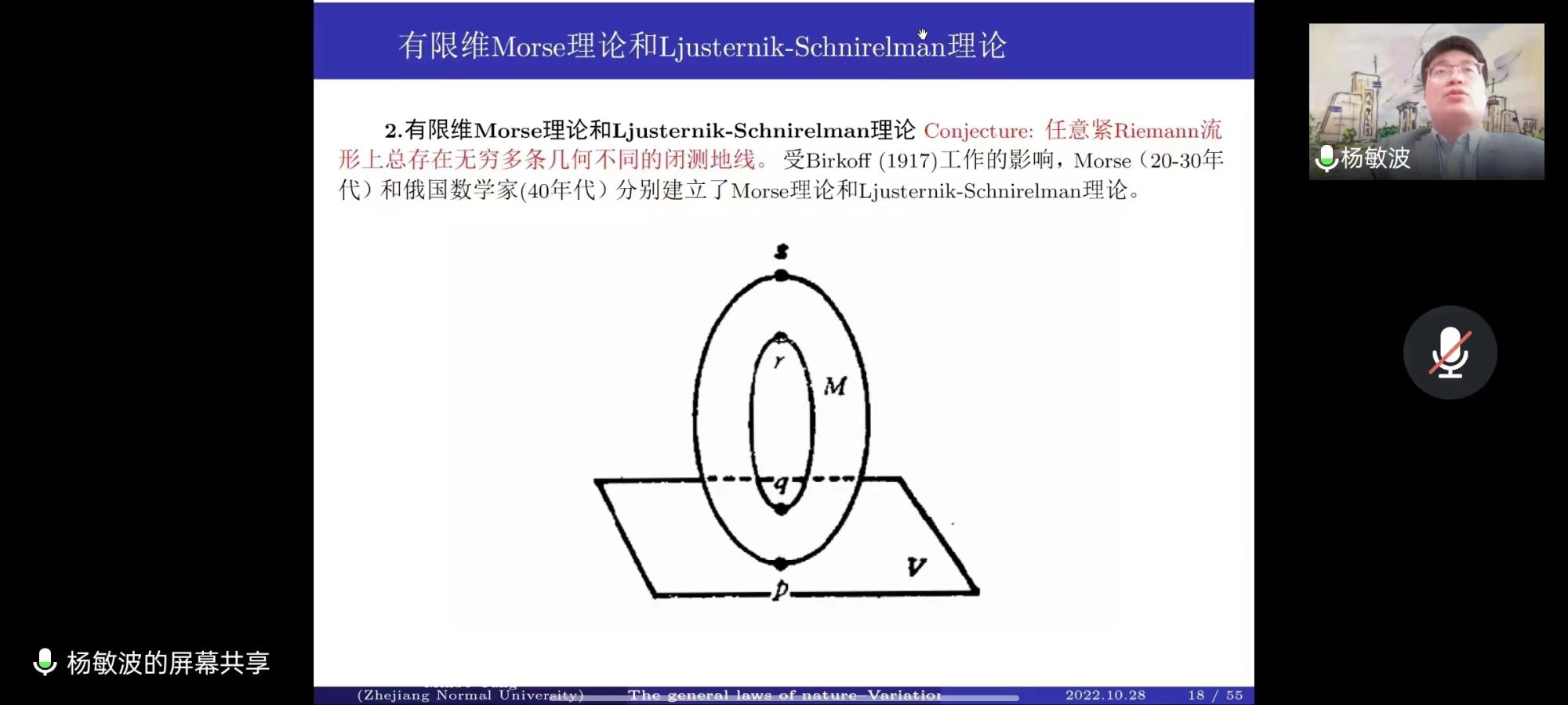 杨教授作了题为“The general laws of natur e- VariationalPrinciple”的精彩报告,全面梳理和深入探讨了变分法的起源、发展与应用。杨教授从欧拉的逼近方法、狄利克莱原理、有限维Morse理论、 Ljusternik- Schnirelman理论、 Berstein猜想、山路定理等详细展开变分法的起源与发展,并从Floer理论、Yamabe问题、薛定谔方程等方面讲解了变分法的应用。杨教授表示要时刻关注着变分法的长远发展,要对数学问题深入研究,要为数学的发展做出贡献。同时,杨教授也对数学研究生们的学习提出了 几点建议:第一,要懂得读的书永远不嫌多,找老师永远不嫌少,在整个学习过程中要努力刻苦,认真仔细。第二,在数学研究中不能只追求写论文的速度,更要重视论文的质量。第三,如今数学的发展非常快,如果仅仅关注单一的研究方向,很有可能会被数学界所淘汰。他建议研究生们要打下扎实的基础,不仅要学习自己研究方向的知识,也要积极拓展知识面,了解数学各研究方向的内容,只要坚持不懈、刻苦钻研,一定可以取得令人满意的结果。