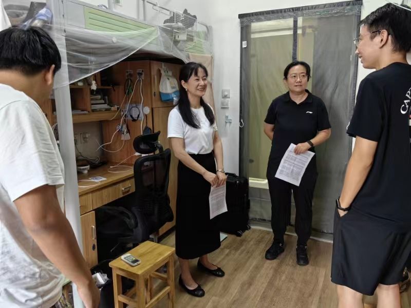 党委书记霍妍、党委副书记姜萍、学术副院长李莉、党委委员全晶晶、学工办主任吴琳华和24级研究生班主任张瑶瑶一行走访研究生新生寝室,关心新生入住情况,送上来自黑料718