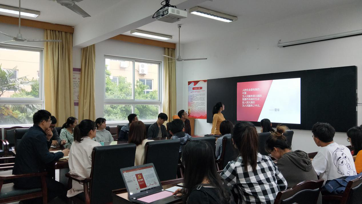 首先是第二党支部的刘婧博同学先从服务于奉献谈起,为我们介绍了数学学院的品牌项目——第五号室友,高年级的党员、预备党员、积极分子积极帮助大一大二同学适应新生活,为学弟学妹们服务,将自己投入到为其他人服务之中;接下来,王一峰同学作为数学学院党员发展工作中心的代表,同时也作为数学师范班的同学,讲述了与自身日后的事业有关的感动中国十大人物的乡村教师张玉滚的事迹,十七年如一日的对学生的教导为我们传递了无私奉献的精神力量;数学第一支部数师班代表王高磊同学为我们介绍了屠呦呦女士与钱学森先生充满爱国奋斗精神的优秀事迹,只有不忘初心,牢记使命,才是当代青年有所作为的秘诀,才能够更好的实现自己的人生价值。