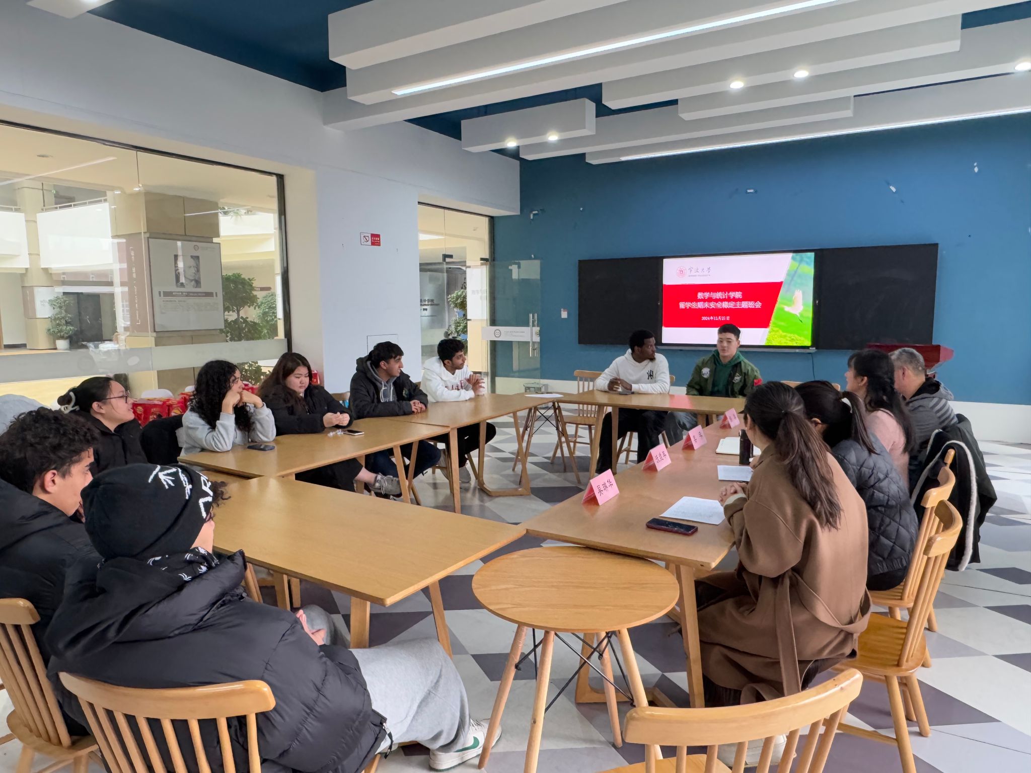开展了留学生期末安全稳定主题班会,学院党委副书记姜萍、学工办主任吴琳华、留学生班主任沃维丰、缪群以及13位留学生共同出席了此次主题班会。学院围绕交通安全、校内外住宿须知、出行请假销假、严禁“三非”等主题进行了安全警示教育,同时,围绕期末和假期事项做了提醒和工作布置,旨在加强留学生管理,确保期末及寒假期间的安全稳定。