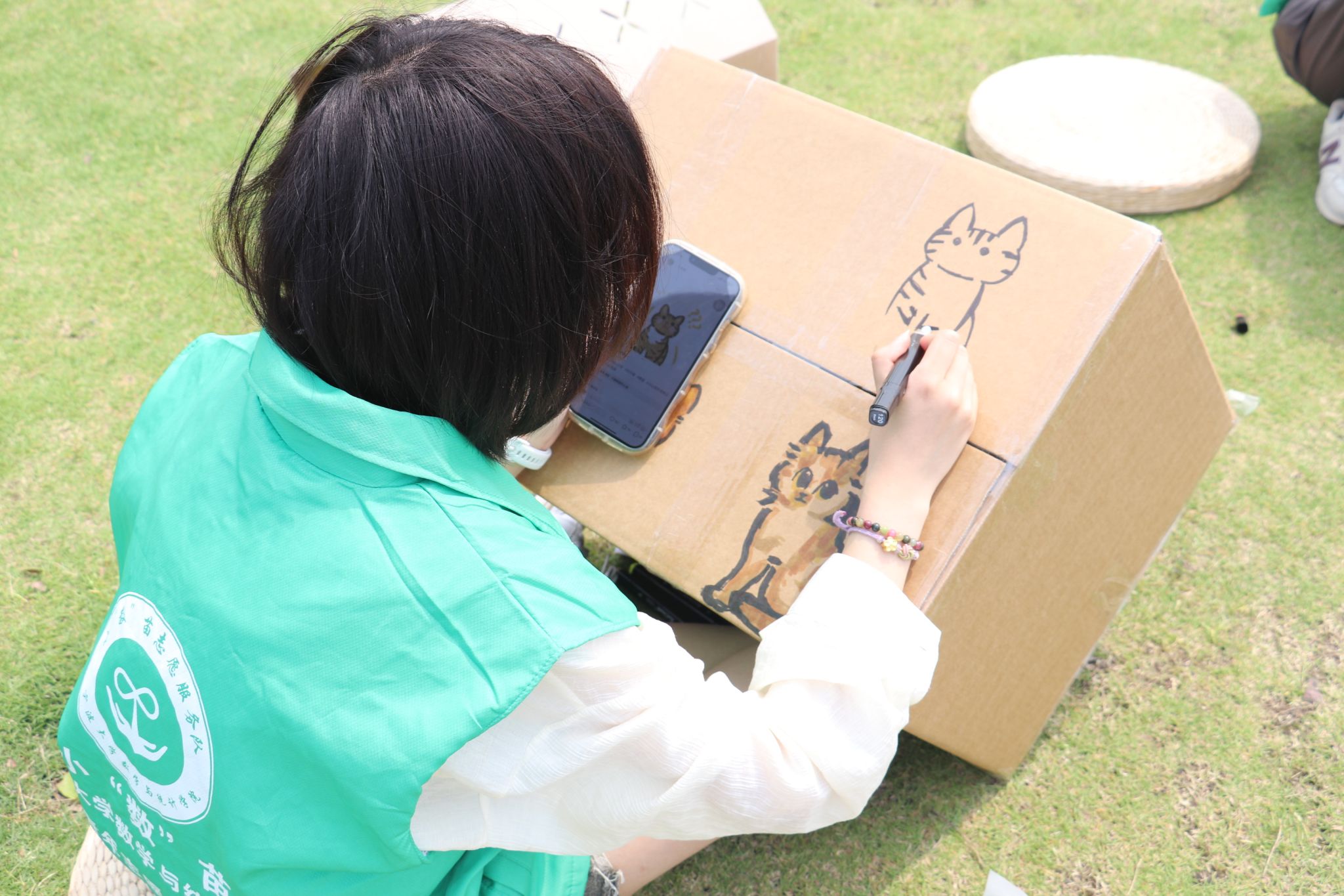 活动现场,小“数”苗志愿者们邀请宁大教职工子女共同将废旧纸箱、布料改造成创意猫窝。其中,由废旧纸箱改造而成的“联排别墅群落”尤为引人注目:坡顶防雨设计的“江南小筑”、内衬羊羔绒的“温暖胶囊”、配备毛毡窗帘的“景观庭院”,每个猫窝都凝聚着00后大学生的环保巧思。大学生们耐心指导孩子们裁剪纸箱、粘贴布料,而小朋友们则尽情发挥创意,有的绘制卡通头像,有的粘贴萌趣对联。最小的参与者是年仅5岁的宁大教职工子女乐乐,他认真地为猫窝铺设碎布“床垫”。在欢声笑语中,数十个充满童趣的猫窝陆续诞生,这些作品将被安置在校园内的流浪猫聚集点,不仅实现了废旧物品的循环利用,更在孩子们心中播下了关爱动物的种子。