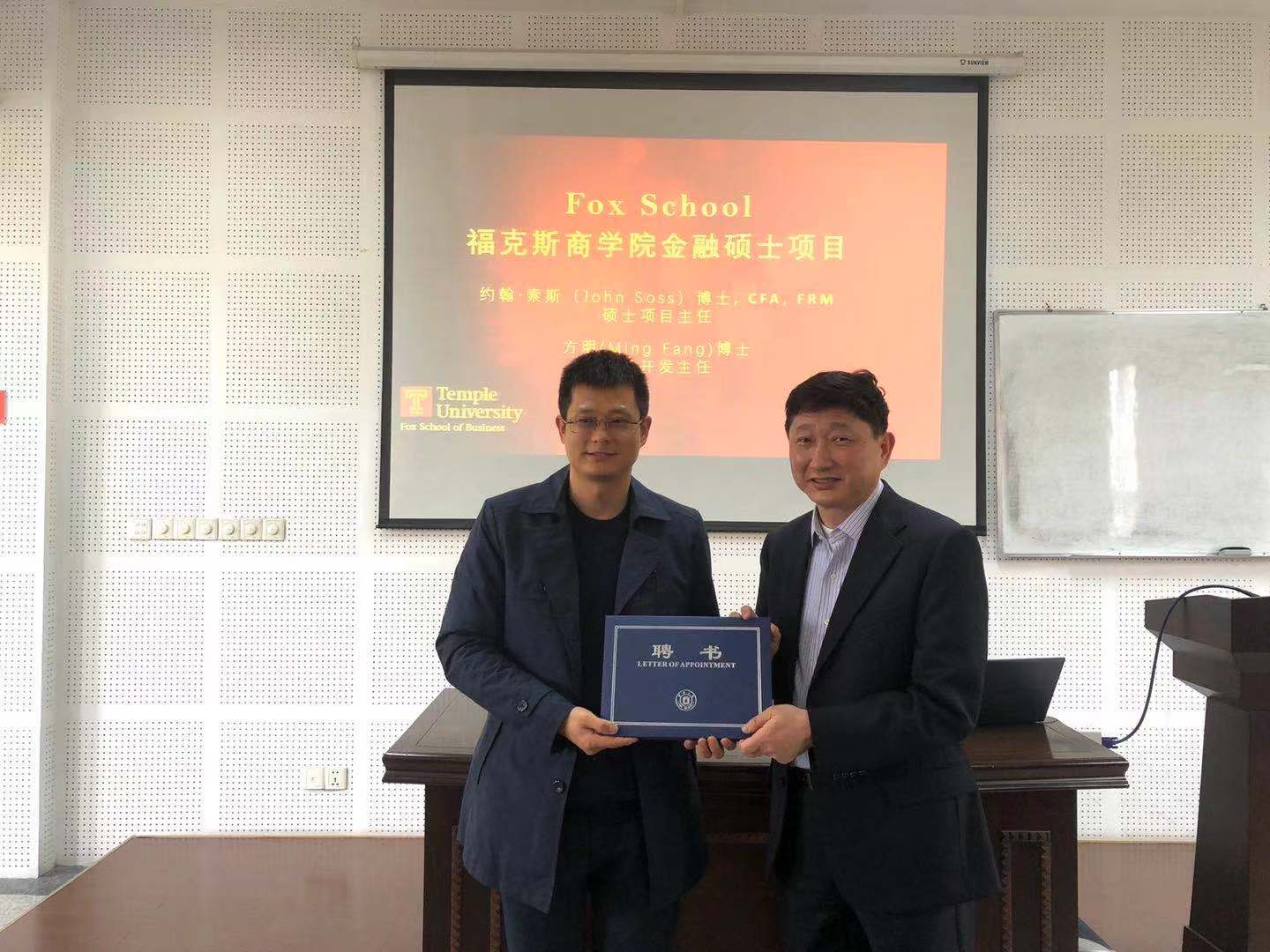 近日,美国天普大学的方明教授一行来黑料718 交流,我院党委书记俞金波为天普大学方教授颁发了黑料718 兼职教授聘书。方教授和SOSS教授给黑料718 广大师生介绍了天普大学-黑料718 合作项目。天普大学(Temple University)金融、精算相关专业有相当实力,与黑料718 有长期合作关系,目前已有三位黑料718 毕业生在天普大学深造。
