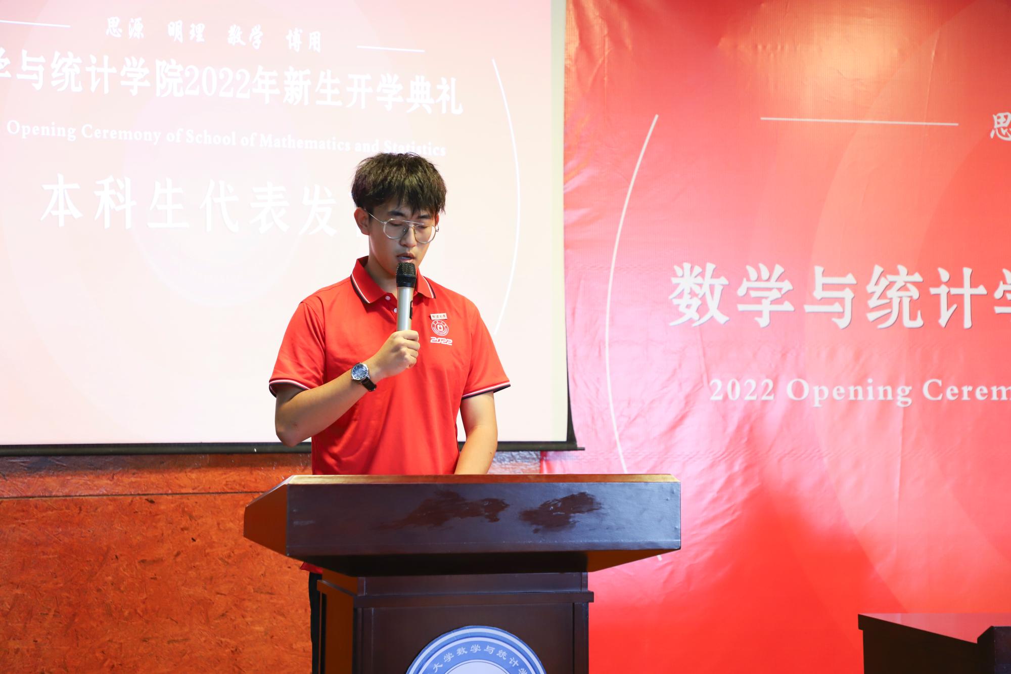 开学典礼在全场庄严的奏唱国歌中拉开了帷幕。首先,来自2022级数学与应用数学(拔尖人才创新班)的盛逸来同学作为本科新生代表上台发言,他讲述了自己选择数学的原因——对数学理性严谨真理的沉醉和对数学发自心底的热爱,并激励同学们要刻苦学习。接着研究生新生代表魏庚辰同学进行发言,他作为本科也在宁大的一名学子,在表达对数院浓厚学术氛围的赞叹的同时,也不忘为新生们提出“明确目标,自主创新”、“博采众长,厚积薄发”、“修身立德,志存高远”的倡议。之后,由院领导给新生代表们佩戴校徽,成为一名正式的数学人。