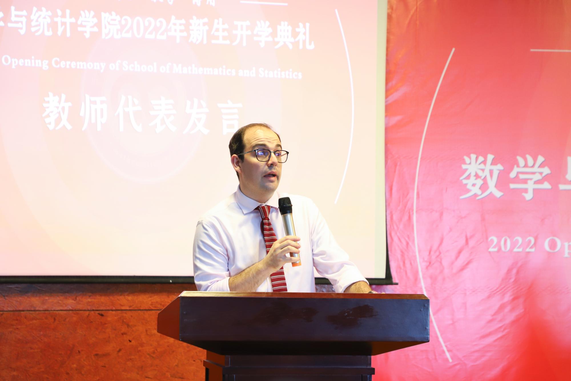 接着教师代表何洪津教授以自己的学习经历为例,从“感恩、坚持、学习、健康”四个方面讲述了数学带给他的乐趣,也希望新生们能够享受学习数学的过程。随后,刚在6月份加入数院大家庭的Matteo Casati博士进行发言,他怀着追求共同进步和深入学术研究的期待,在构建学校国际交流合作新格局的政策方针下,对同学们提出“及时尽自己所能地完成任务”,“和朋友们一起学习”以及“学会教别人学习”的三个学习建议。