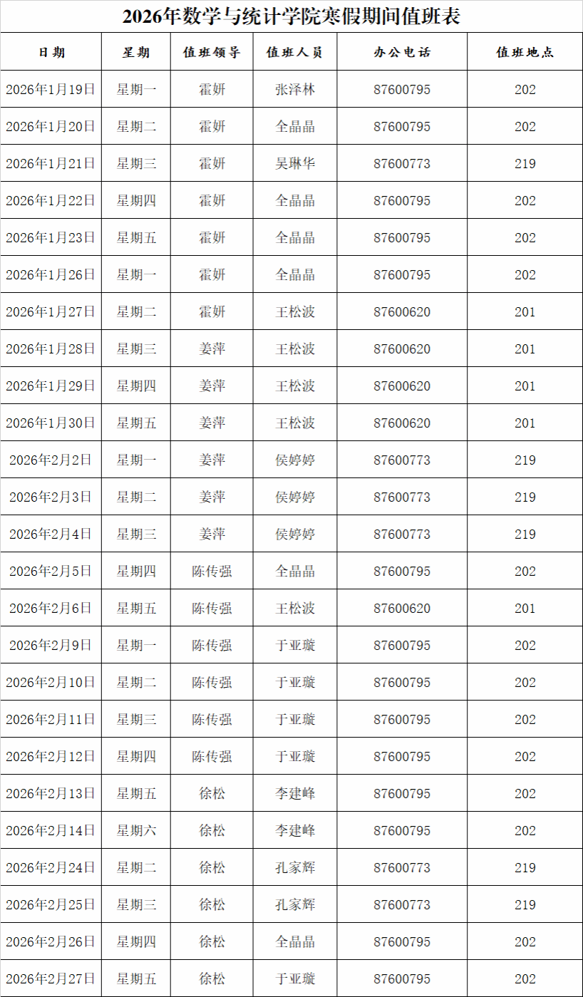 根据《黑料718 校长办公室关于2026年寒假和假期值班工作安排的通知》中的安排,寒假期间,各单位部门值班人员要明确工作职责,尽职尽责完成值班工作。值班时间为每天8:30-16:00。具体安排如下: