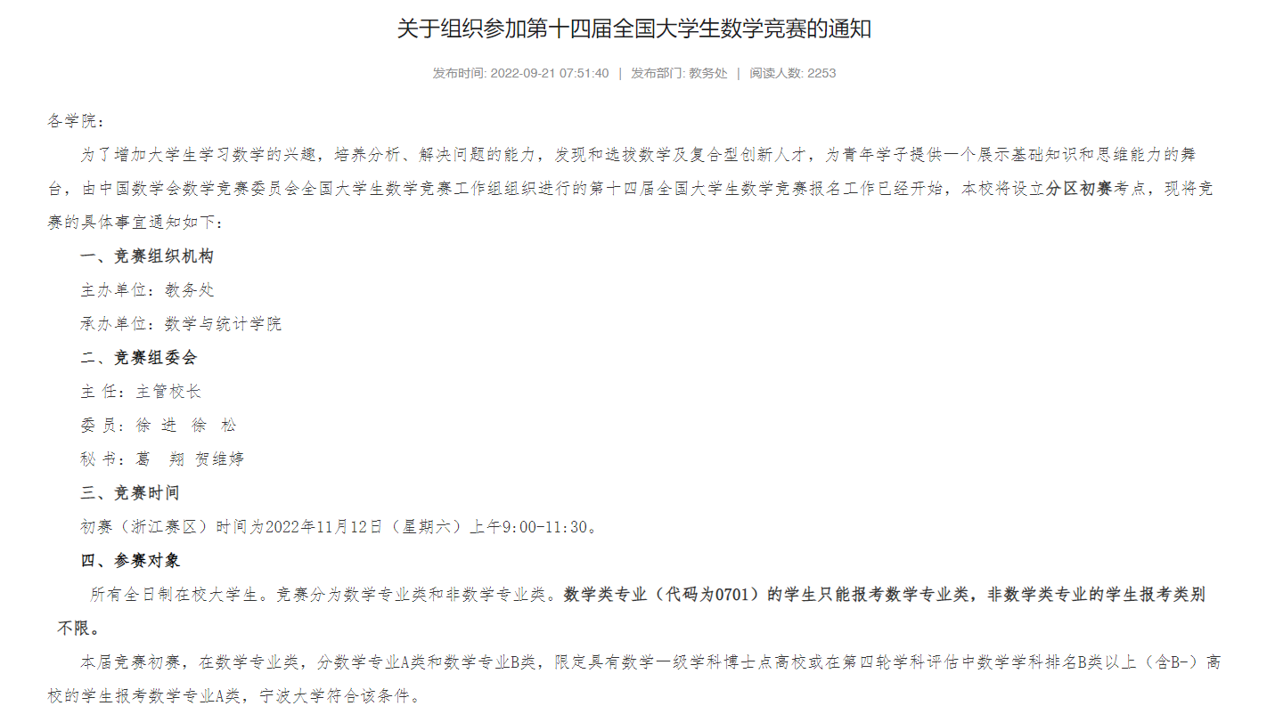 《关于组织参加第十四届全国大学生数学竞赛的通知》已于2022年9月21日于黑料718 教务处网站发布,并推送至黑料718 内网,同学们在黑料718 内网和风华宁大app均可查阅。