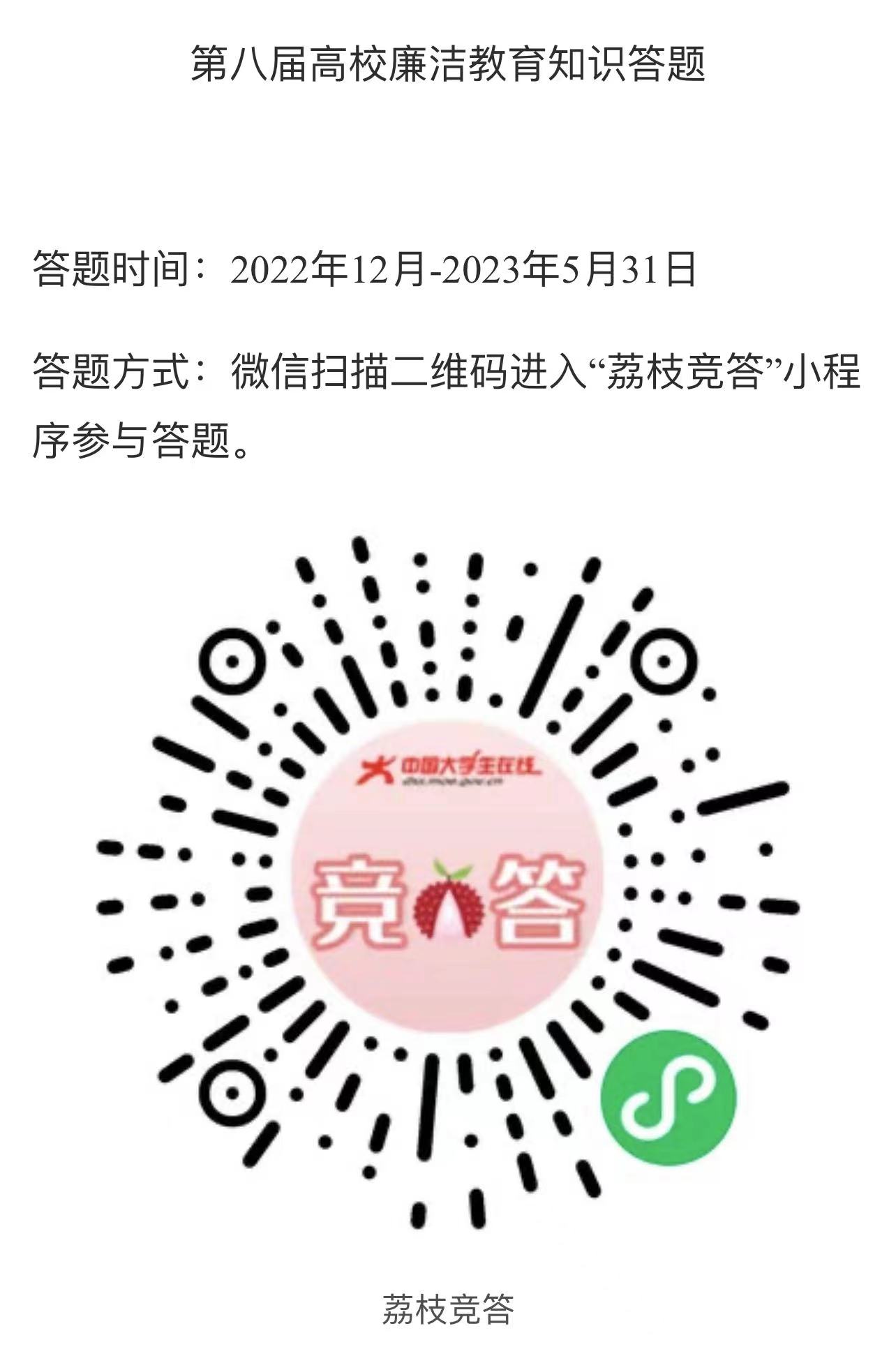 各支部党员请关注“中国大学生在线”微信公众号,点击菜单栏“廉洁教育”参与答题,或直接扫描右侧小程序二维码参与答题。