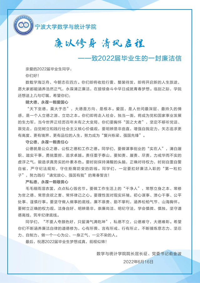 ”的专属logo,由82级数学系校友、校友会会长严正亲自为毕业生们系上这“人生的第一条领带”,并叮嘱毕业生们在面对即将到来的职场诱惑中要保持诚信正直,不要被利益所蒙蔽,守住底线,在清廉的人生道路迈好“第一步”。在致2022届毕业生的廉洁信中,学院领导和老师们愿毕业生们都能在新的人生旅途中,涵养浩然正气,永葆清正廉洁,在持续奋斗中早日成就青春梦想。
